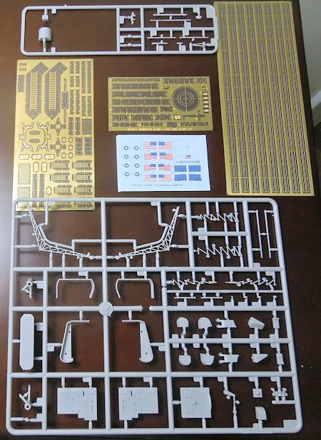 Instructions are proto-typical Trumpeter. There are 56 steps on 44 pages with mostly detailed and blown up black and white drawings. It’s highly suggested that one go through the instructions with a fine tooth comb first. Even with 56 steps, many parts of the instructions contain way too many small pieces with arrows colliding with each other on the way down to the ship below. Also, Trumpeter seems to be adamant that you assemble everything first, than as an afterthought 3,4,5 or 6 steps later, have you try to bend a railing and then glue it onto the pieces without knocking off plenty of others and feed the carpet monster. A single small decal sheet with the some flags, the ship’s number and the ship’s name is also included. Painting instructions are included on one color sheet. The ship is only offered in her 1945 surrendering scheme so if one want to do her in her earlier war service or post WW II years, then research is needed.