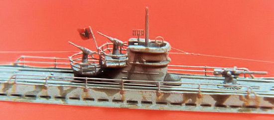 Excellent as these kits are, I now recognize that there are a few problems too: Type VII deck is just a little too wide and the hull is a bit off in shape, not fully capturing the graceful, sleek appearance of the type when viewed from above. The Type IX is better, but there are inaccurate bulging ballast tanks on the hull at the waterline which should be removed. Also, the conning towers for both subs, representing both the small early and the later extended types with augmented AA, are just a bit short, and the periscopes for Type VII should have separate shears rather than the combined structures provided for both subs.