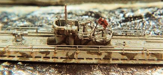 Once the basic colors were dry, both boats received thin washes of dark gray along with liberal streaks of lightened gray hull color, white, and brown rust to simulate the paint deterioration universal among World War Two-era submersibles. (Of course, “liberal” in tiny 1/700 scale is relative; a very light touch was all that was required!)