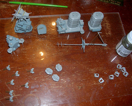 superstructure pieces while on the sprue, I attached the deck pieces into the