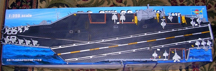 This is a mammoth kit. About the same size as the Tamiya CVN-65 USS Enterprise, Trumpeter goes many steps further by including a hangar deck in 3 pieces complete with molded-in tie downs and the option of full- hull or waterline- eliminating the need to saw off the lower hull of the Tamiya Enterprise. The kit is very well packaged, heavy, and contains north of 800 parts (most of which are from the air wing!)