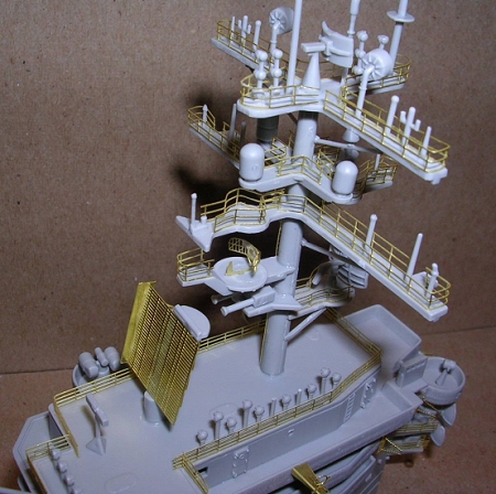 I started with the island. It went together very well and I added photoetch as I went along. Adding railings to the mast and extensions was very delicate and tricky because there is not a lot of room to work with. There were no bridge window railings on the first cruise. NOTE: use clear acetate from a 3 ring binder sheet or some other clear plastic for the bridge windows. The GMM set also includes individual wiper blades for each window! I knew I would make a mess of that so those stayed on the brass fret!