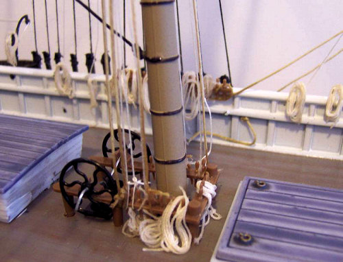 Moving on I then used tan lines for the lifts using plastic blocks and sending them down to the mast rails. Thicker for the main yards, thinner line for the upper yards.