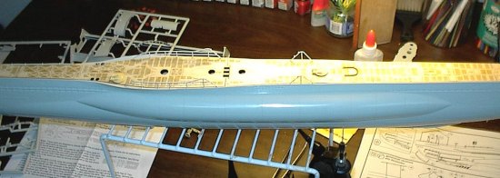 As big as this kit is, it is not a difficult model to assemble. Even the 2 hull halves (it comes out around 31 inches long) went together very precisely after adding 2 hull supports. You have the choice of showing the forward torpedo doors open or closed. I did mine closed and have heard that there is a fit issue if you choose to show them open so be careful there.