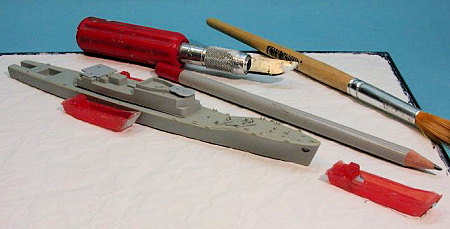 the fore deck, filling in the mounting hole for the turret. I also plated over