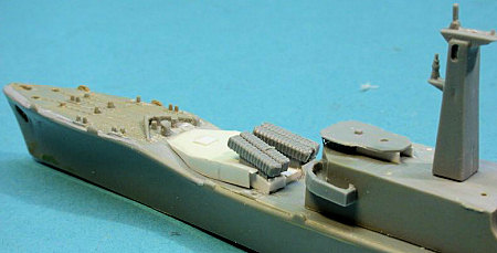 I had learned earlier on that WEM´s 1:600 scale Exocet launchers were way overscale, so I used the Airfix ones. BTW, the Airfix instructions have you simply glue the Exocet launchers instead of the turret ...