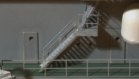 When the additional fret had arrived, I completed work on the upper levels. On the main deck, I used the 3-bar railing. To simulate the netting or canvas or whatever is sewed to the railing around the helipad, I used Kristal Kleer. It might just as well look completely different in reality, but I fashioned it somehow the way the kit parts were, just finer.