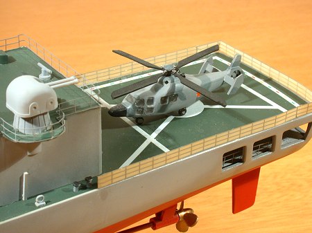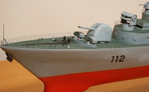 Now modern warship modelers include some of the most gifted guys I can imagine. If you want to see their work, look into the specialized sites like modelwarships.com. It will take your breath away! Some of these guys rig tiny ships in 1/700th scale with dozens of gossamer-like thread and even man them with figures, which must be about a millimetre tall. Now that is far beyond my abilities, so I felt happy with the larger scale. I did some googling on the Harbin and found a set of pictures, mostly taken during a fleet visit to U.S. Waters. But there wasnīt really a lot of references readily available. But you could see some details, and man what a lot of detail a modern ship has! I quickly realized how simplified this kit was and easily envisioned the Chinese dad with his son sailing this model with a simple remote control on a pond (the pond probably populated by ducks destined to become crispy #54 one day). The instructions showed how to install a simple R/C. Much was simplified in order to get the thing to float and make it more sturdy in handling. So the stern bay was only hinted at and sealed with transparent styrene, and the railings were way oversized. I decided to improve whatever came into my mind and see where it took me.
