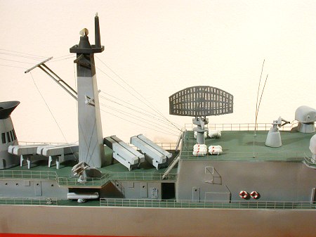 Hi all, my name is Frank and Iīm a ship modeler by heart (collective gasp). Iīve built lots of aircraft and I love them, but ships intrigue me in a special way. Iīve only built a few of them over the last years, mostly due to space constraints and my intent to get practice in all the various techniques Iīd like to master and am slow to learn. But such a complex thing as a ship has a very special appeal to me. I still possess Revellīs 1/96th USS Constitution and Alabama, built when I was 17 and 28 respectively, and the new kits and techniques Iīve discovered on the net over the years have made me itch for building a modern warship even more. (Editor's Note: Typical of ship builders, Frank sent in a ton of images, but only one of the overall ship! What I've done is give a stem to stern tour of the port side of the ship in the larger images and put the build stuff into thumbnails. I hope that you are as impressed as I with the work that went into this build.)
