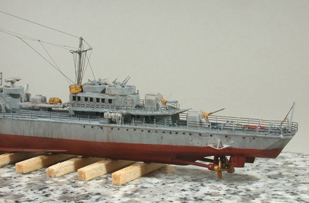The numerous recessed windows and bulleyes were painted black with a waterproof marker; in spite of much care taken, that necessitated some corrections. Finally I was able to glue the superstructures to the hull and fill the remaining gaps, touching up the paint here and there. I also added the radars and the screws and prop guards at that time, leaving me with a ship complete but AAA, weathering, railings and rig.