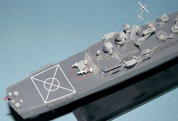 I recently purchased a Gold Medal Modelworks PE set for 1/700 USN modern warships which was sprayed Haze Grey. I used this to add railings where ever needed. I didn’t add many rails midships because I was kind of lazy so my excuse is that assumed that they would be removed during action stations. I used internet photos to figure out where the rails went and there actually more than I thought there were. The set even had rescue netting which I used around the helo pad.