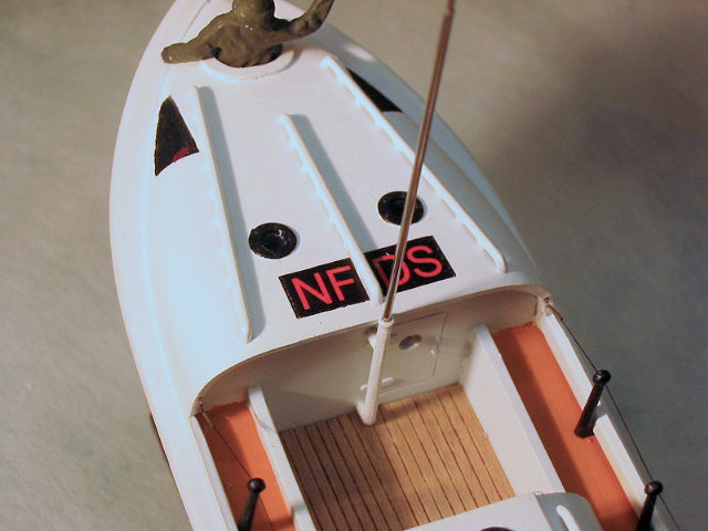 In the 1950s, the MLBs also were marked with their Station's radio call sign. The lettering was placed on the top of the midship cabin, in orange letters on a black background. Station Chatham's call sign was “NSDF”. It was easy to create the necessary graphic on my computer, but my printer wasn't up to the task of printing it on decal paper. My friend Pip tried, and he couldn't get a good decal either- the edge where the orange met the black just wasn't sharp enough.