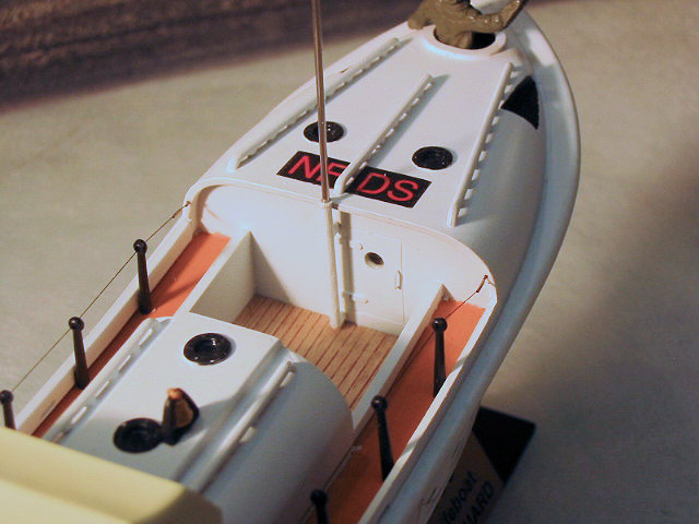 A tricky part in painting USCG boats and cutters is the tan color used for masts and other trim. The color is named “Spar” and is FS 10371. That color is not available in any model paint line, but Model Master's Deck Tan is very close. I used that color to paint the sheer deck and the flagstaff.