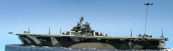 The deck number and line decals where then applied and these went on very well. There are a bunch of the deck line decals, each an inch to two inches long. Getting these to form a straight line along a flight deck about 15 inches long is a challenge in itself. After these dried a light yellow oil wash was splotched on the deck, in sections. I then took a wide flat brush damp in turpenoid and drew across the flight deck to give it a more “beat up” look and to lighten it from the hull color. I dotted the hull with tiny spots of oil paints, ranging in colors from grays to reds. Again, with a brush just damp in turpenoid, I brushed down along the hull, giving it a slight streaky look and to vary the hue of the paint.