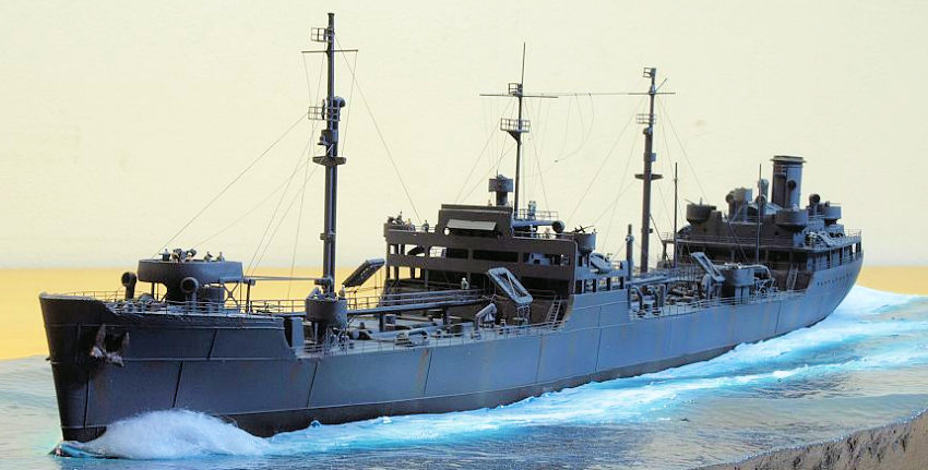 With the tanker, I did more weathering and application of rust, quite enjoying the process. That done, I started adding the numerous subassemblies until all were attached. Some cargo was placed on the frames, but not much. A number of crew figures livened things up on the vessel, this time they were oriented towards the carrier. Quite more rigging than for the carrier and a final flat coat completed the project.