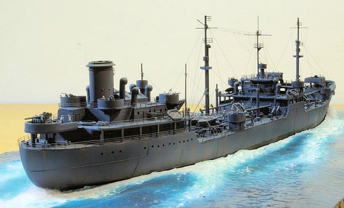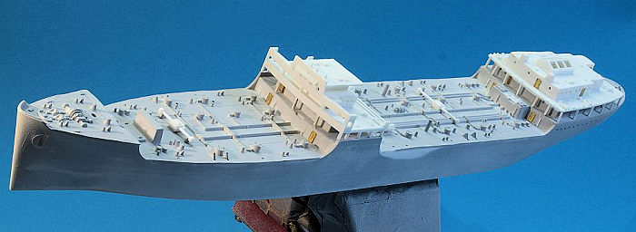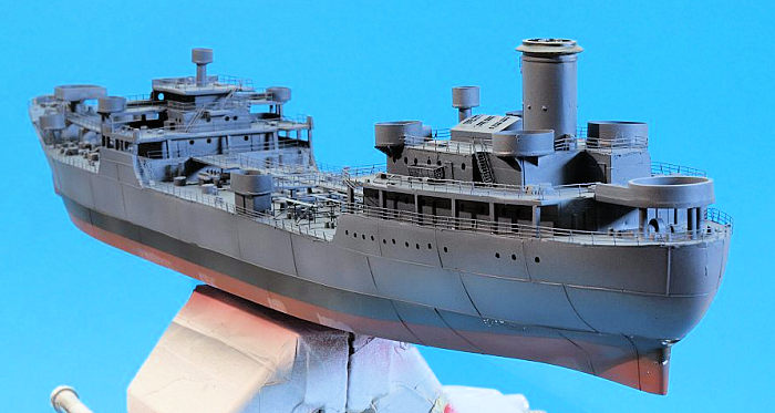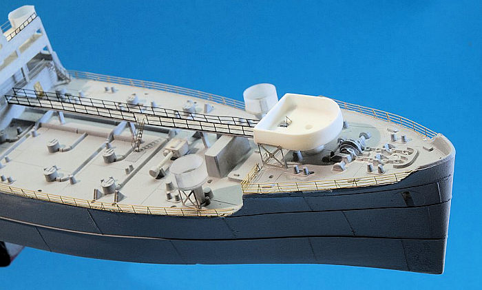 The long central raised walkways were scratchbuilt and extended to the cargo frames erected over the vessel´s deck.
