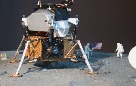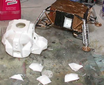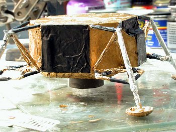 After correcting the basic shape came mounting the thruster mounts, which had to be corrected themselves as the areas where they are applied are the ones you have to perform surgery on. Having completed this, I started wrappng the ascent stage with aluminum foil. I tried to recreate the crumpled look I had seen in pics of the real thing, redoing it until I found I couldn´t improve this time. Next came painting the craft, and that was a hard task. I finally decided which route to follow and which parts had to become black and which not. Having achieved this, I built the access area and various antennae, correcting some of it and leaving some OOB. The thrusters were dremeled out, painted exhaust metal and glued. The decals were applied and corrected per instructions. Now came the last chapter.