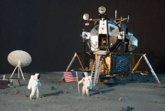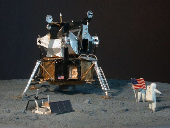So I finally had a LM standing on my workbench, nowhere near perfect, but finally looking acceptable to me. I built the various experemintal devices and painted them according to reference found in the NASA´s image banks. The astronauts were sprayed white, the visors were picked out gloss black and some details grey and red. Their suits were weathered with grey where they were covered with lunar dust. Armstrong´s flag was made using the kit decal mounted on a piece of aluminum foil to give it some more stability.