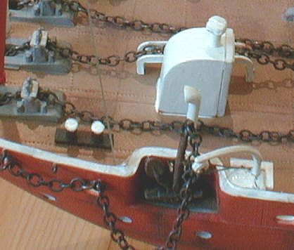 --Removing the molded-in anchor chains with a Dremel (very carefully) and replacing them with real chains, weathered with
