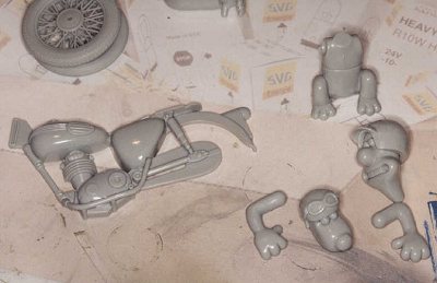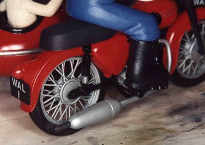 Nick Park's brainchildren have starred in three animated movies so far, becoming extremely popular. So there's no wonder that merchandising has discovered the popular duo. To my delight, Airfix has produced two W&G kits after scenes from the latest movie, „A Close Shave", the one on the motorcycle and Gromit alone in the detached-and-turned-fighterplane sidecar, firing the devastating porridge gun. I choose the former, since I was looking for something very politically correct and non-violent to display in my practice. I wasn't so sure how far some people's tolerance would go facing a porridge gun point blank.