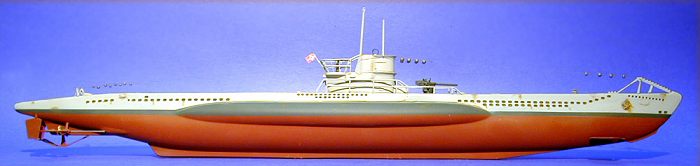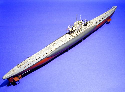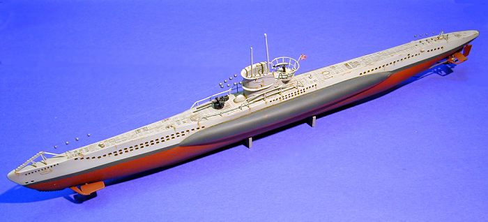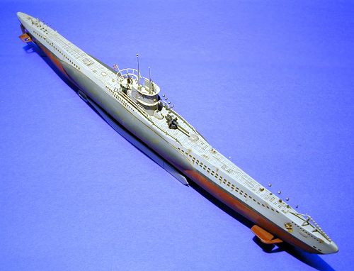 The kit comes with a “torpedo” stand that cradles the finished model by the keel for display. Once built up, the model is fairly impressive, and accurately represents the shape and dimensions of a Type VIIB U-boat.