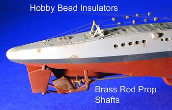 The third modification was to string the long wire antennas from the bow and stern to the conning tower. I used small fishing line for these wires. After stringing some beads I picked up at Hobby Lobby on the fishing line to represent the insulators seen on these boats, I drilled holes in the hull and the conning tower with a pin vise and attached the antennas using CA glue. In hindsight, the beads I used were a little too large and if I had it to do over again, I would search for a smaller, flatter bead than I used (the real insulators looked like oval tin cans instead of balls).