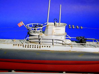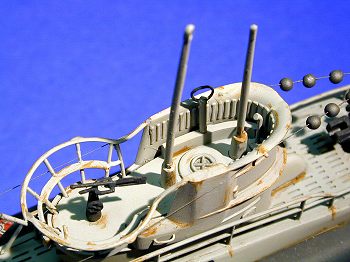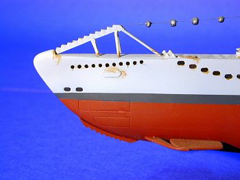 Some of the parts (for example, the deck railings that frame the conning tower and the net cutter on the bow) are on the thick side and out of proportion, so one might opt to replace these and/or thin down the kit parts. Additionally, the grab handles and horseshoe-shaped life buoys are molded onto the conning tower, and, as a result, not very authentic looking. Finally, one could opt for drilling and carving out all the flooding holes (there are about 200 of them! Needless to say, I did not elect to do this).
