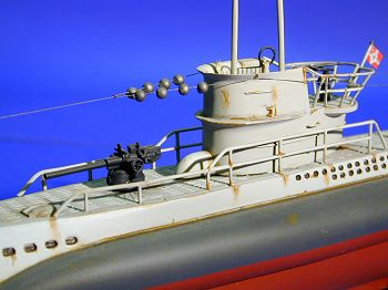 I decided to model a generic VIIB, so I chose not to use the U-99 decals. To give it a little more color, I also opted to depict the model with a red lower hull (I have found paintings of these boats with both a dark gray waterline and lower hull and red…others may pick their own poison!). I painted the entire boat with Model Master light gray, and then I masked off the hull top and sprayed the bottom sides of the hull with dark gray. To finish off the hull, I masked the water line and sprayed the rest of the hull with Floquil anti-fouling red.