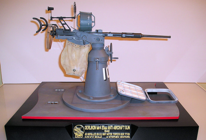 The deed is done; the project that consumed my time through December of 2014 and six months of 2015! Some people forget the inspirations of their youth as they grow older and they become engrossed in adult life but us artist types are blessed with the ability to carry them forever as if they were locked safely away in a steamer trunk. I was 14 years old in 1963 when I saw the movie ‘PT-109’ for the first time and left the theater immensely inspired with not only the story behind that boat and its crew, but all things related to PT (Patrol, Torpedo) boats and the exploits of all their crews in the Pacific Theater of World War Two. The PT- 109 was an early 80’ Elco torpedo boat made famous by its last commander, Lieutenant, Junior Grade John F. Kennedy. You probably are familiar with the story of how the PT 109 was cut in half by a Japanese destroyer while on night patrol in August of 1943 and how Lt. J.G. Kennedy and his executive officer, Ensign Leonard Thom saved the majority of their crew. Most Elco series PT-103 through PT-196 boats had a single rapid fire Swiss Oerlikon 20mm Mark 4 anti-aircraft gun on a pedestal mount in the stern position so replicating in scale a portion of that position was my goal.