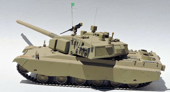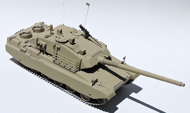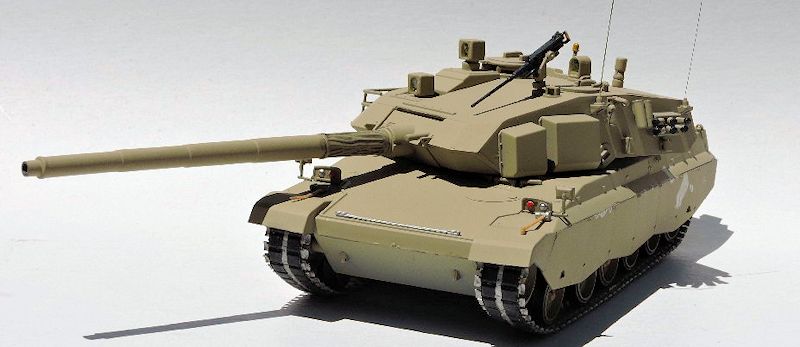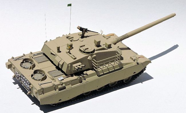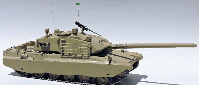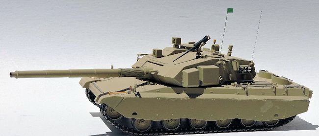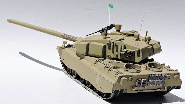 A nice set of pioneer tools, clear covers for the vision blocks and good external machine gun are included. The tracks are the rubber band type and look accurate for the prototype shown to Saudi Arabia for trials. Decals consist of a set of white numbers.
