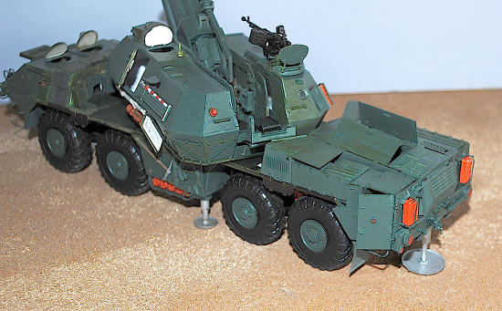 Mounting the two turret parts onto the base plate is a little tricky, once again test fit and sand as necessary to ensure a tight fit. You will not be able to clamp these down when you glue them, as they are covered with the little bits mentioned above. I did not use the kit supplied tow cable, as it looks terribly out of scale, and really detracted from the nice mean look of the gun assembly. The auto loading escalator (?) goes into the turret halves without a hitch, and now, with all of the little pieces on, you can finally mount that gun onto the chassis. Viola !