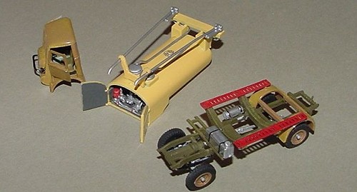 Step 1: The cab is made up of 9 pieces with no locating pins, just angles. Attach part 4 (the interior front panel) to the front of the truck prior to gluing it to the main body, then attach the rear of the cab and the roof at the same time. Use a slow setting glue for easiest results. There is no steering column or wheel provided, so you will need to scratchbuild one, I used an old 1/72nd radio loop antennae with some stretched sprue for the crossbraces and column.