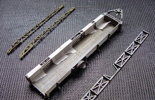 Steps 10-12 are somewhat complex, in step10,you assemble the boom…steps 11 and 12 need to be done almost simultaneously. Carefully fit the rear boom slave (134) through the deck plate, then cement to the floor (141) and let dry. (see pic) Then you can add on the sides, front, and rear of the crane.