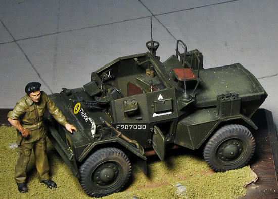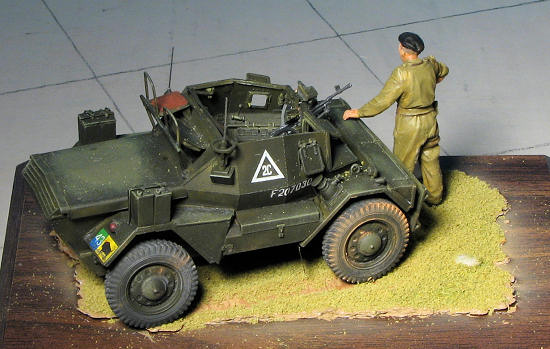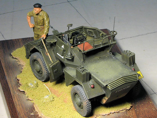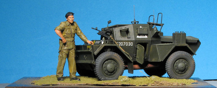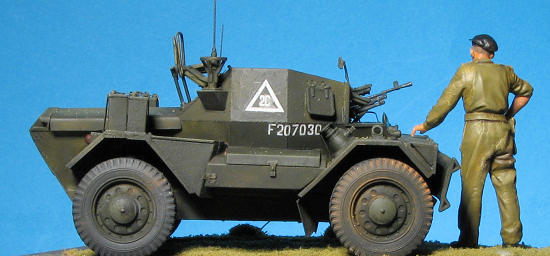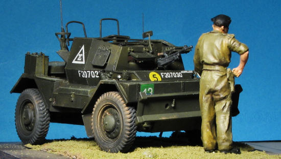The figure was next. I like to have at least one figure either on or standing next to the vehicle being displayed. I think it adds interest and a feeling of perspective as to the size of the vehicle. I also try to either find a figure that is posed as naturally as possible by the sculptor, or, as in this case, construct one myself from available sources. In this case I used the figures that came with the kit. The legs, lower torso, and upper torso are from the commander figure. The left arm, head, and beret were from the maniacal driver figure. I must admit that I cheated to get the right arm for the pose I had in mind. This piece came from the original MiniArt British Armored Car Crew kit. I don’t remember which figure I stole it from. Painting figures is the subject of another discussion. Suffice it to say that the figure was painted and detailed using Panzer Aces (a division of Vallejo) and Vallejo acrylics.