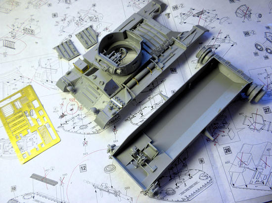 of the lower hull and attaching all of the road wheels and idlers. Step 38 is