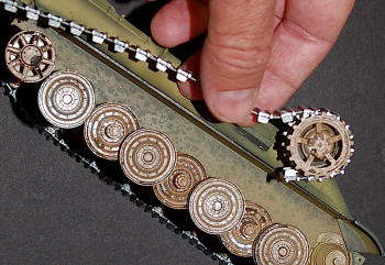 I glued the droop segment of the tracks to the front sprockets, then slid them