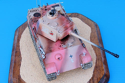 The tank was then sprayed with a matte clear coat, not a flat…as I said, I wanted this tank looking ridiculously brand spanking new. I did not apply zimmerit, as I doubt they would have used it in the desert, where long range combat was the norm, and the Panther would have really ruled.