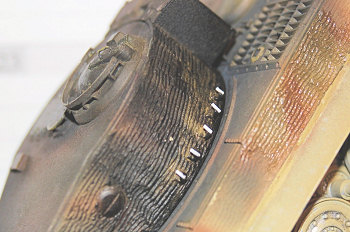 Zimmerit: There have been many attempts made by modelers to accurately reproduce the anti-magnetic paste. Since the zimmerit applied on the late model Tiger tank was done by the factory, there are fewer wavy lines as in the field -applied jobs. I’ve tried bondo, milliput, and a myriad of other pastes, but have settled on DAP’s “Presto Patch”, a modified water based exterior compound. The zimmerit paste used on the vertical surfaces of the Tiger was tinted yellow ochre by the manufacturer, and you can easily do the same by mixing in yellow ochre acrylic paint to the Presto Patch. Using a piece of a razor saw cut with a pair of tin snips to the right width, apply the paste in small amounts. You will have to apply the paste prior to assembling many of the exterior parts, such as the exhaust stacks, etc. The nice thing about tinting the zimm first, is that when you do your chipping or damage marks, you don’t have to touch it up with paint.