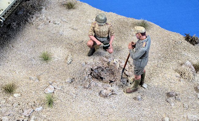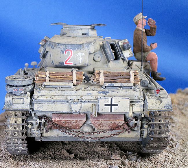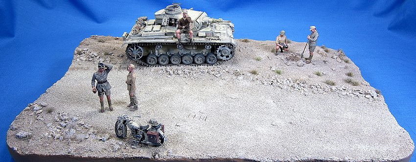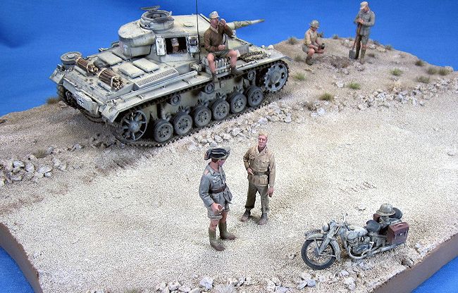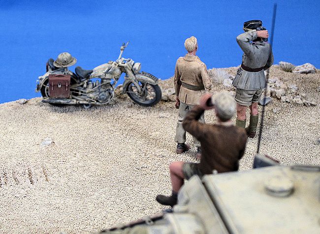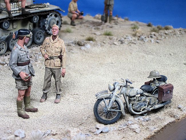 As usually happens I used a mixture of figures from different kits, in this case Dragon’s #6063 “Deutsche Afrika Korps” and Verlinden. I made some minor adaptations to them so they would fit the scene, and then painted them with Vallejo Acrylics. The DKW motorcycle is a Tamiya kit that used to live in an old, now defunct diorama of mine. I applied the hairspray technique to it and gave it a weathered desert coat similar to the Panzer. Finally the tiny scorpions were sourced from an Eduard photoetch set that features rats, snakes, spiders – all sorts of creepy crawlies. Perfect for a haunted house diorama! Some day…