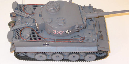 Assembly of the upper hull is very straightforward, and just like the standard Tiger I kit. The kit includes vinyl hose for the air intake hoses, a nice touch. The upper hull has one deviation from scale appearance—a small slot in the rear deck to allow the steel whip antenna for the radio receiver to pass through from the lower hull. Also, the upper hull is not glued to the lower hull, so there is a visible seam where the two meet along the sides of the hull. (Because it falls on a natural seam, it won’t be very visible.)