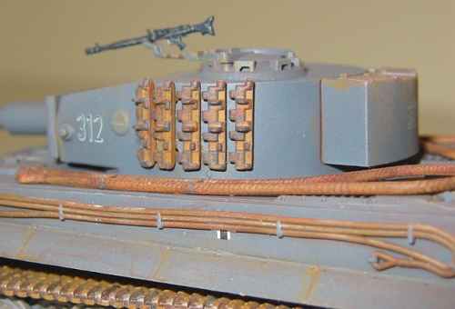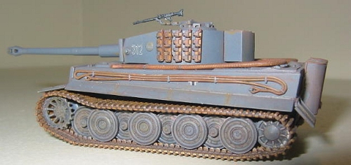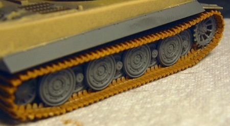 Tigers had two types of tracks- transport and combat. The transport tracks were narrow, basically the same width as the drive sprockets. The combat version of the tracks were wider, extending past the side of the hull. These wider tracks helped disperse the weight of the vehicle, allowing it to operate on softer ground. The tracks included with the kit are the wide version.