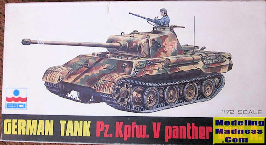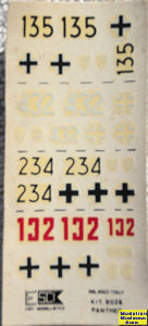 The instructions are of the fold-out type and are well illustrated with exploded views showing a six-step construction sequence. There is a diagram showing all the numbered parts, as well as two photographs of actual Panther tanks. Also included are vehicle specifications and a decal placment guide on a camoflauged tank, yet there is no painting guide for the pattern shown. The decals, in spite of their age, look to be useable and include markings for four vehicles, but I was not able to identify the markings with any known division or unit on the basis of my research.