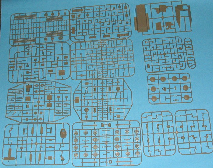 This late-production Hetzer version comes in a big box that is full of sprues of cleanly-molded light brown plastic when you open it up. The very complete kit includes a fully-detailed engine, a fully detailed Pak 39 L48 75mm cannon, and a very complete crew compartment. Unfortunately, all this really nice detail will be invisible if you only open up the small hatches, so one hopes there is some way to display the completed model opened-up to show all this.