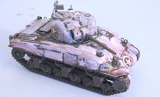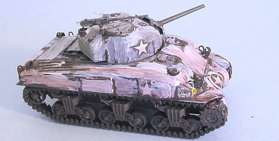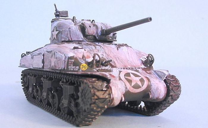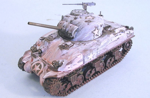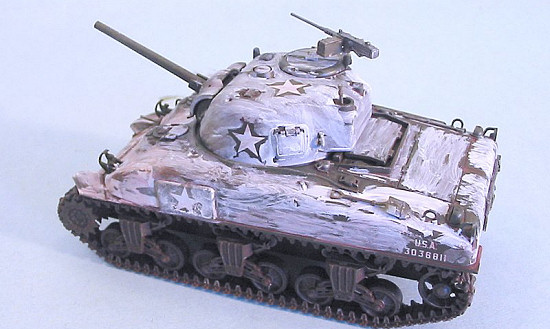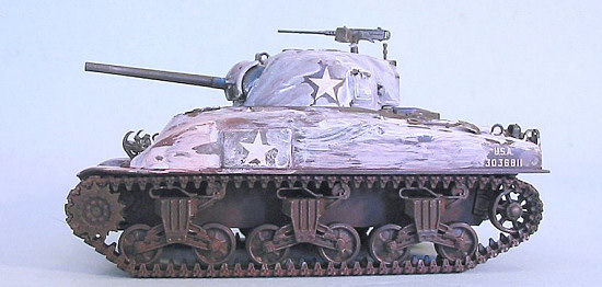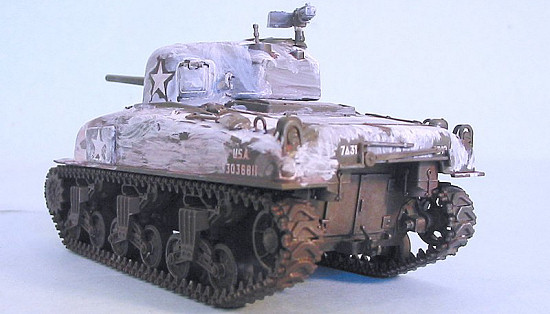 I had been very struck by a photograph in the History Channel documentary of the Shermans of the 761st during the Battle of the Bulge, covered in patchy winter camouflage and mud. Since the Panther tank I had just done was one used by the 12th SS Panzer Division and thus might have been one of the participants in the Battle of Tillet, I decided I would do this Sherman in winter camouflage to represent a tank of the 761st in that fight.