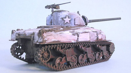 The photos I had seen of the Shermans in their winter camo showed a scheme that can best be described as “ragged.” It would appear the tanks were painted with brushes, without cleaning the vehicles before painting, so that the paint was very uneven in application and was subject to severe wear. I thinned some Tamiya “Flat White” and took a flat-tip brush that was about a “scale” 8 inches wide - the sort of brush most likely used on the real thing - and slopped on the white paint. This was followed with a brush application of thinned Tamiya “Red Brown” to put mud over the winter camouflage. Any tank operating in an environment where only tanks could bring supplies forward would definitely be “a pig in mud.”