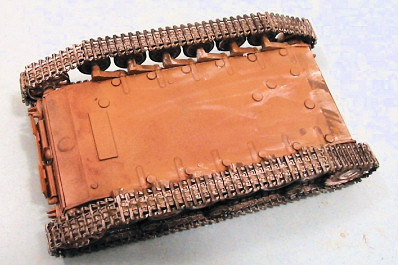 I started by painting the tracks with Model Master Steel. I then painted all the wheels with Tamiya Panzer Yellow. I gave all this a wash of thinned Tamiya Red Brown when that was dry, then hand painted the rubber on the road wheels.