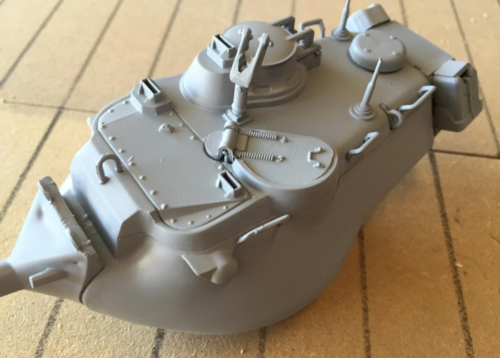 I started by covering everything with a coat of Tamiya primer from a can. I then went after subassemblies. First were the very tedious wheel assemblies. Details on the parts facing out are nice and sharp, but non-existent on the inside parts. The kit does not provide a lot of alignment pins. After applying the glue you have to carefully put them aside without knocking them out of alignment. The main gun, which consists of 5 separate pieces, is the same way. Getting it straight was a challenge. The basic fit of the sides to the hull was good, but the sides bowed slightly. I ended up having to glue one end, clamp it in place, then work my way down the sides, gluing and clamping as I went along. The final fit was good, with some slight seams that I filled with acetone-thinned Squadron white putty. The turret comes in two halves, with the line going right through the middle. The seam was small and also took some Squadron white putty.