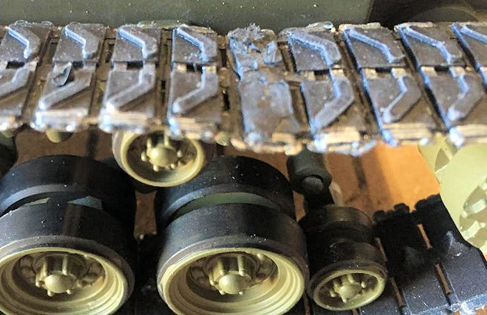 Although the tracks were black rubber, they were shiny and didn’t look like most armored vehicles I have seen. I primed them, sprayed them flat black, and detailed the metal link parts with Testor’s acrylic steel.