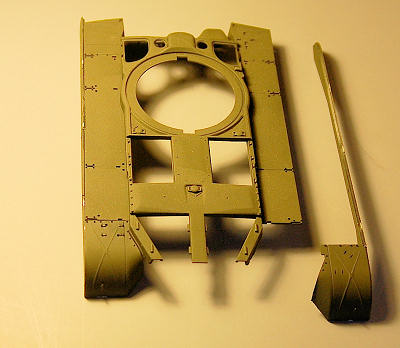 Turret: Ignore the instructions completely. Glue the upper turret half to the