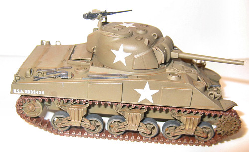 The subject of this kit is a 1943 Production, 75mm M4 tank. This tank has a welded hull, but still has the early-style three-piece, bolted transmission cover. The tank carried the standard 75mm gum, but with the later full-width mantlet. Two of the three vehicles on the decal sheet carried appliqué armor.